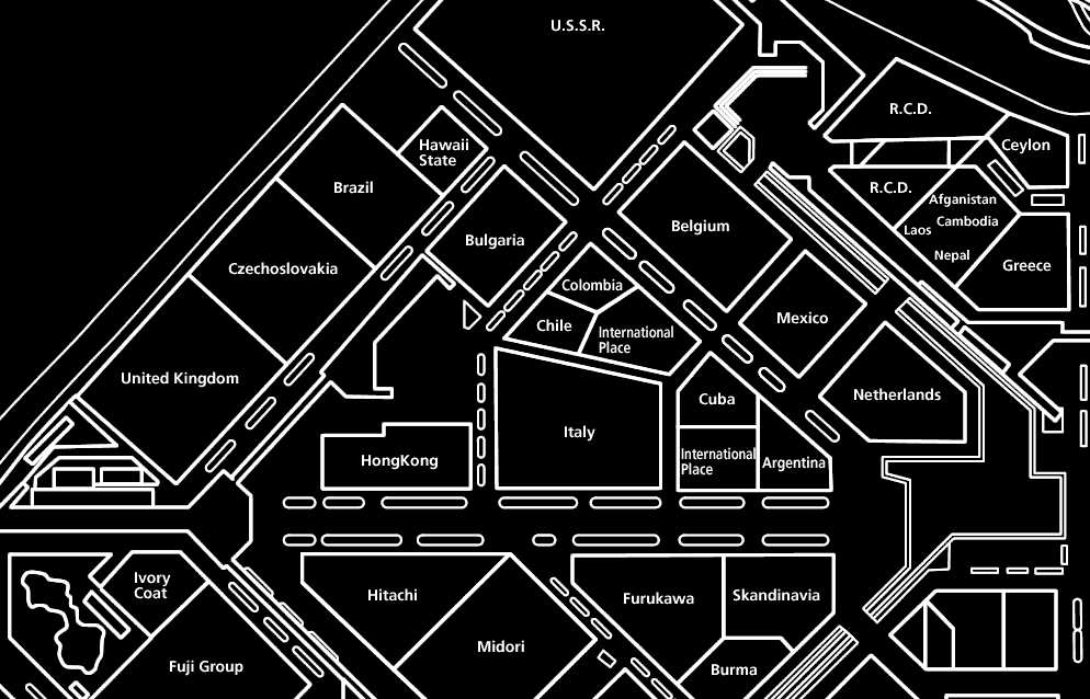 日曜広場 月曜広場 火曜広場 水曜広場 木曜広場 金曜広場 土曜広場 大地の池 夢の池 EXPOLAND 全体図